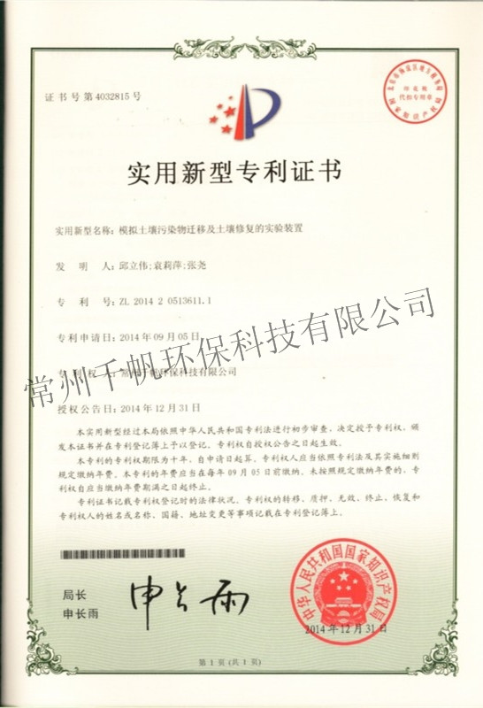 实用新型专利证书 模拟土壤污染物迁移及土壤修复的实验装置