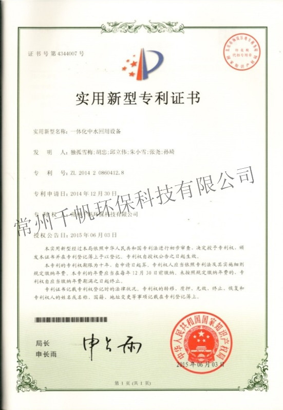 实用新型专利证书 一体化中水回用设备