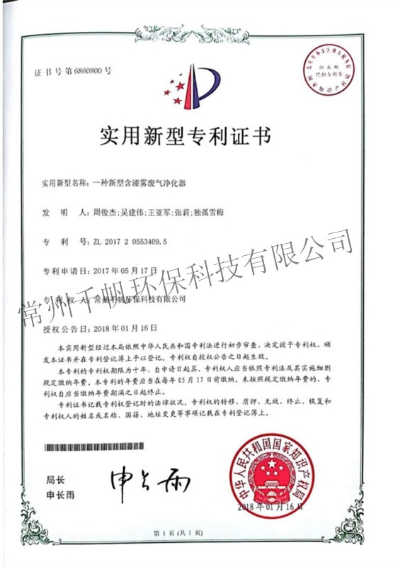 实用新型专利证书 一种新型含漆雾废气净化器